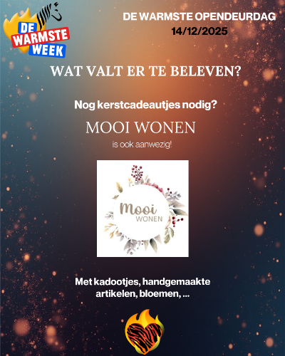 Wat kan je verwachten? – Demo’s en productinfo – Gezellige sfeer – Acties voor het goede doel – Kans om ons aanbod te ontdekken - Zondag 14/12/2025 13u30 - 17u00 Kanaaldijk 4G, Ravels - Verwarm je met iets lekkers gluhwein € 5 , warme chocomelk € 3 , jeneverke € 3 , warme wafel € 2 en verschillende goodies ten voordele van de Warmste Week - viering van haar nieuwe locatie