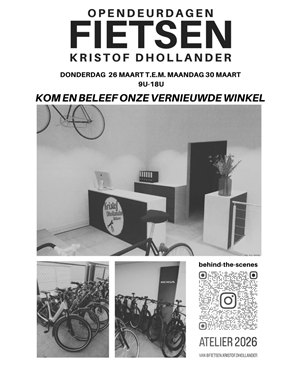 Opendeurdagen bij vernieuwde fietsenwinkel Kristof Dhollander van donderdag 26 maart tot maandag 30 maart.
