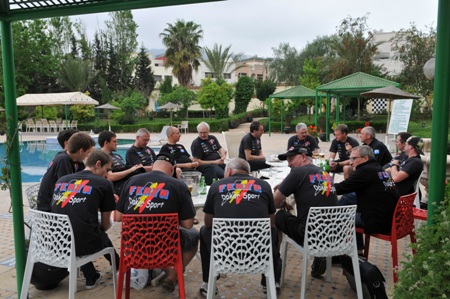 Uiteindelijk hebben we een andere taxi gebeld en zijn we dan toch in ons hotel geraakt. De mannen met de trucks zijn pas deze ochtend omstreeks 05.00u aangekomen. Zij werden de ganse dag en avond opgehouden aan de douane in Tanger.” Dinsdag was een rustdag voor het team en werd er tijd gemaakt om cultuur op te snuiven. “We hebben de straatjes van Fez verkend” zegt Pascal Feryn. “Fez bestaat uit een oud en een nieuw gedeelte. We bezochten de Medina, het oude stadsgedeelte dat met zijn smalle straatjes van amper anderhalve meter breed dat volledig omwald is. Je kan er overal kraampjes vinden. Een oude smid, een beenhouwer, enz … In totaal zijn er 60 à 70 km van die steegjes waarin je makkelijk kan verdwalen. Het was prachtig om er eens te gaan kijken en heel ontspannend. Omstreeks 17.00u waren we terug in het hotel en zijn de mannen die de ganse nacht gereden hadden meteen gaan slapen. De rest van het team heeft zich te goed gedaan aan fantastische cous cous. Morgen gaan we met zijn allen naar de technische keuring. Donderdag is er een briefing en in de nacht van donderdag op vrijdag vertrekken we om 04.00u in de ochtend naar de eerste klassementsrit. We kijken er met zijn allen naar uit.”