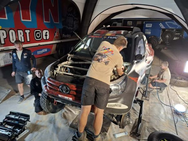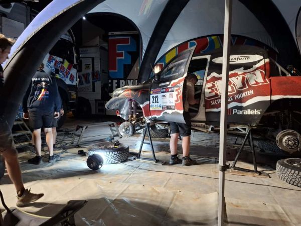 Al werd daar woensdagnamiddag ook een beetje gesakkerd en heel misschien wel gevloekt. “Vandaag geen duinen meer op het menu, wel een flinke dosis stof vreten”, begint Koen Wauters zijn verhaal van de dag. “We kregen een snelle en bochtige piste voorgeschoteld, heel plezant om te rijden ware het niet dat ik mij bij het oversteken van de weg vijf meter naast de piste heb gezet en mij volledig op mijn buik vast kwam te zitten in de modder. En daar stonden we dan. De zandplaten werden uitgeladen, de hydraulische krik in gang gezet waarna de wagen nog dieper wegzakte. Er was geen scheppen aan. Gelukkig was er een vriendelijke deelnemer die stopte en ons uit de blubber heeft getrokken. Ik denk dat we daar een kwartier hebben verloren. Het was balen want het was zo stom.”