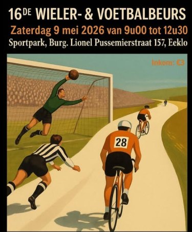 Op zaterdag, 9 mei 2026 wordt reeds voor de zestiende maal een wieler- en voetbalruilbeurs ingericht in Eeklo ! Die gaat door in het Sportpark, B.L. Pussemierstraat 157, 9900 Eeklo (de zaal is gelegen op 300 meter van het station). Wie op zoek is naar publiciteits- of persfoto’s, tijdschriften en boeken, voetbal- en wielershirts of andere objecten zal hier zeker zijn gading vinden.